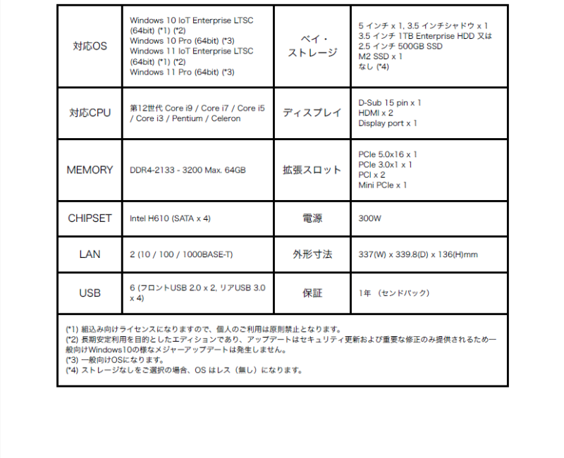 OSはWindows 10 IoT EnterpriseLTSC、Windows 10 Pro、Windows 11 IoT EnterpriseLTSC、Windows 11 Pro に対応。